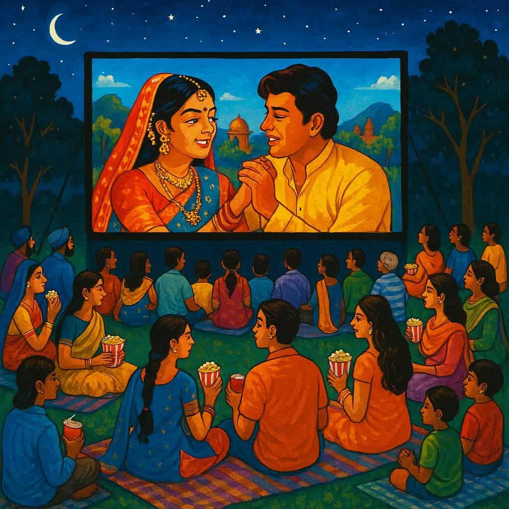 A relaxed evening screening of a popular Bollywood film, often accompanied by Indian snacks like popcorn masala, samosas, or chai. It’s an excellent way to bring people together and introduce Indian cinema to all age groups.